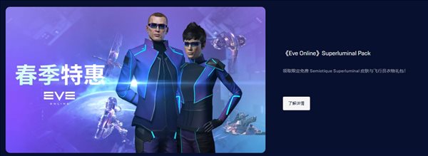 《星战前夜(EVE Online)》本身是一款免费的太空沙盒游戏,交易,挖矿,并参加规模巨大的 PvE 以及 PvP 战斗。在 4 月 7 日前领取《星战前夜》Superluminal Pack,获取四款酷炫皮肤,以及一套独特飞行员衣物。该内容为Epic限时专属赠品。