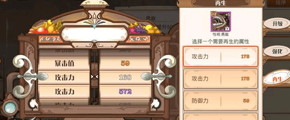 图中滚轮属性类型数据中有生命值以及攻击力两种较好属性可供再生,属性数值栏也有3种橙色数值。