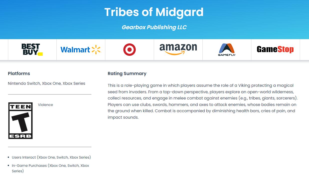 美国游戏评级机构ESRB对《米德加尔的部落》的Xbox Series X|S、Xbox One和Switch版进行了评级,开发商Norsfell Games和发行商Gearbox Publishing尚未正式宣布该作的Xbox版和Switch版,但伴随着新分类评级的上线,这种情况可能很快就会发生改变。