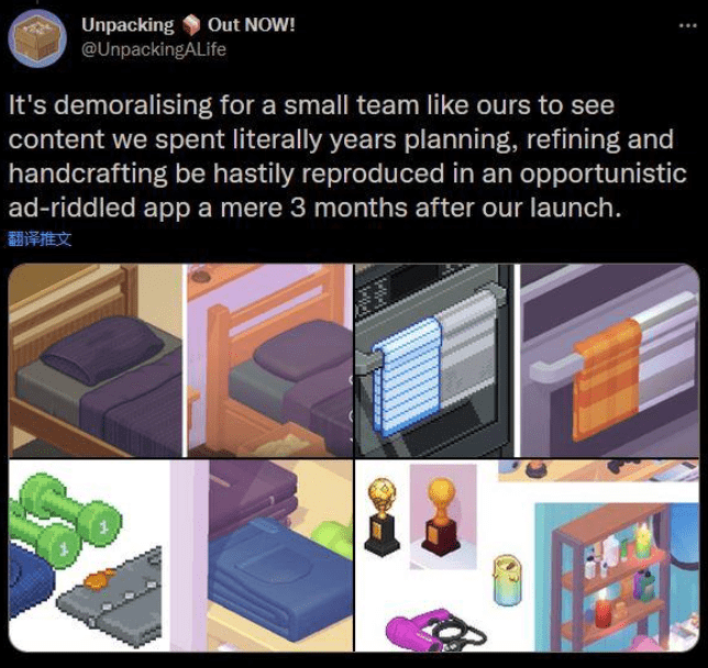 《Unpacking》是之前风靡世界的趣味小游戏,这款游戏目前被“山寨”盗版的很严重。开发团队针对这种情况强烈谴责,并希望玩家们不要去玩。由 Witch Beam 开发、Humble Games 发行的休闲益智游戏《Unpacking》,今(25)日在官方推特上发表声明,他们并没有推出《Unpacking》的手机版,如果手机用户在广告上看到风格相似的作品请不要去玩,那些全都是抄袭的游戏。