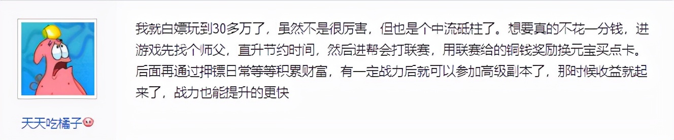 议论正激烈的时候,恰好一位白嫖党出现讲述了自己的历程,这位玩家表示想要彻底的不花一分钱,进入游戏的第一件事情就是先找个师父。因为拜师可以让你不做任务直接升级,节省大量时间,随后就是加入一个帮会,只要帮战打上了,就可以用联赛奖励的铜钱购买元宝,然后用元宝购买点卡。