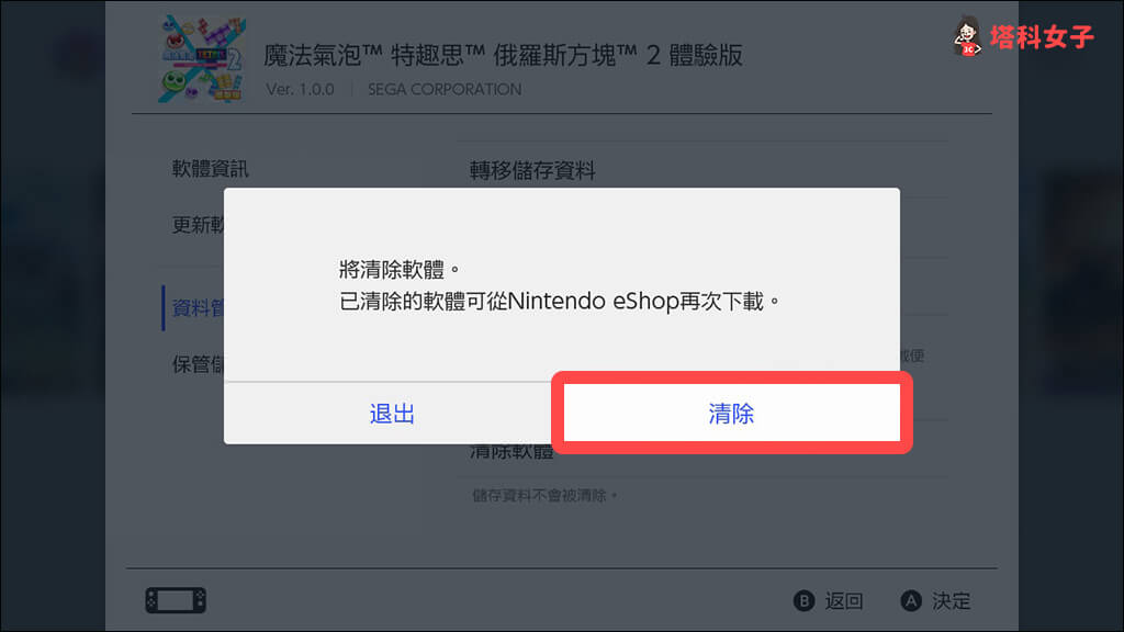 再次点击清除以确认在 Switch 删除游戏,删除后的 Switch 游戏软件仍然可以在 Nintendo eShop 内重新下载回来。